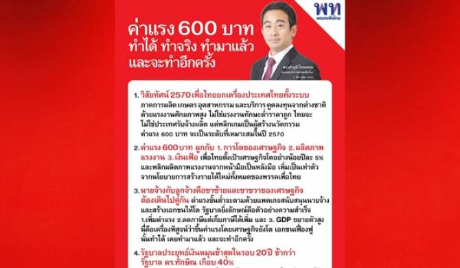 เด็กเพื่อไทยยันค่าแรง 600 บาท ทำได้ ทำจริงและทำแล้ว จะทำต่อไป